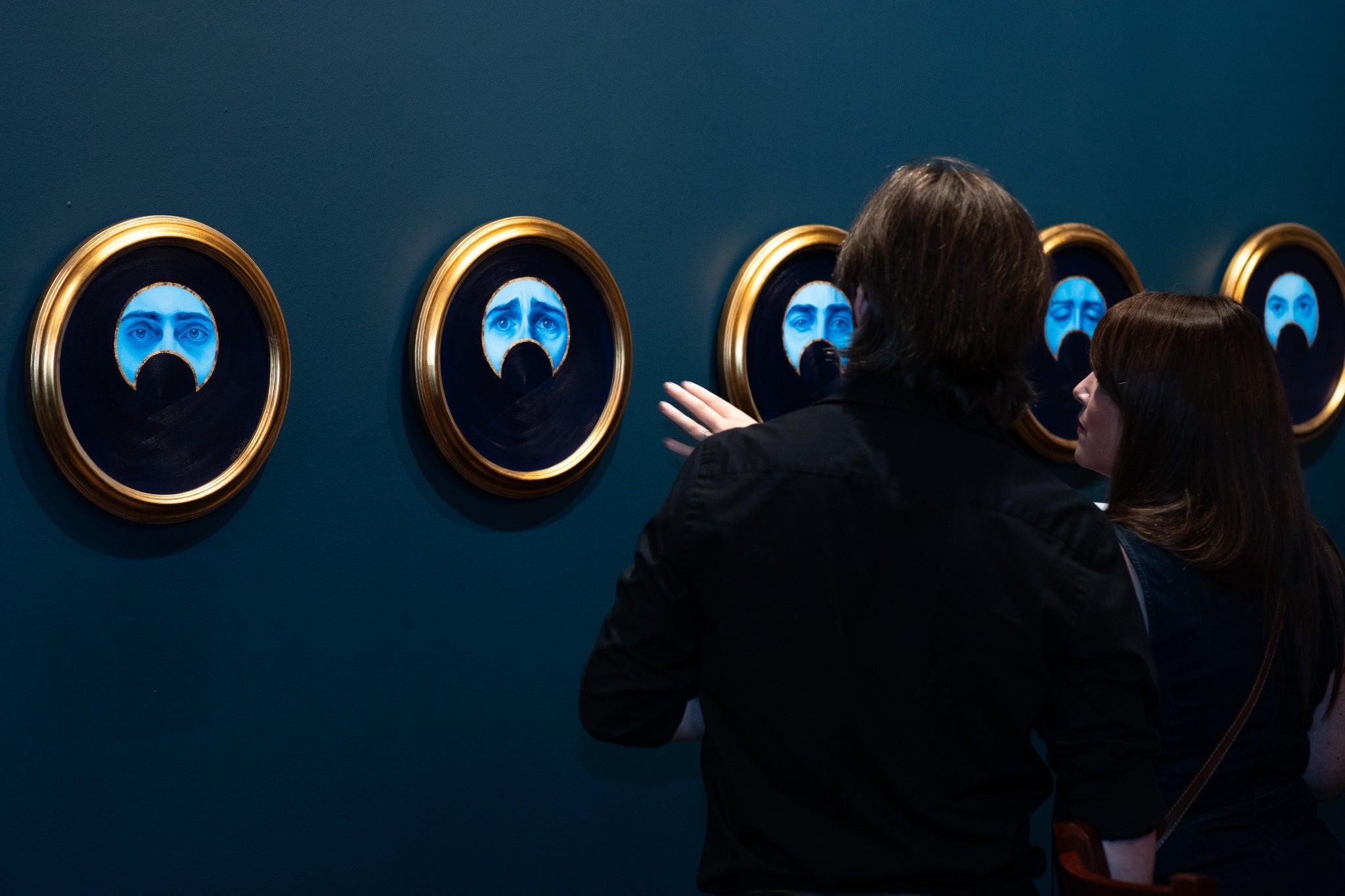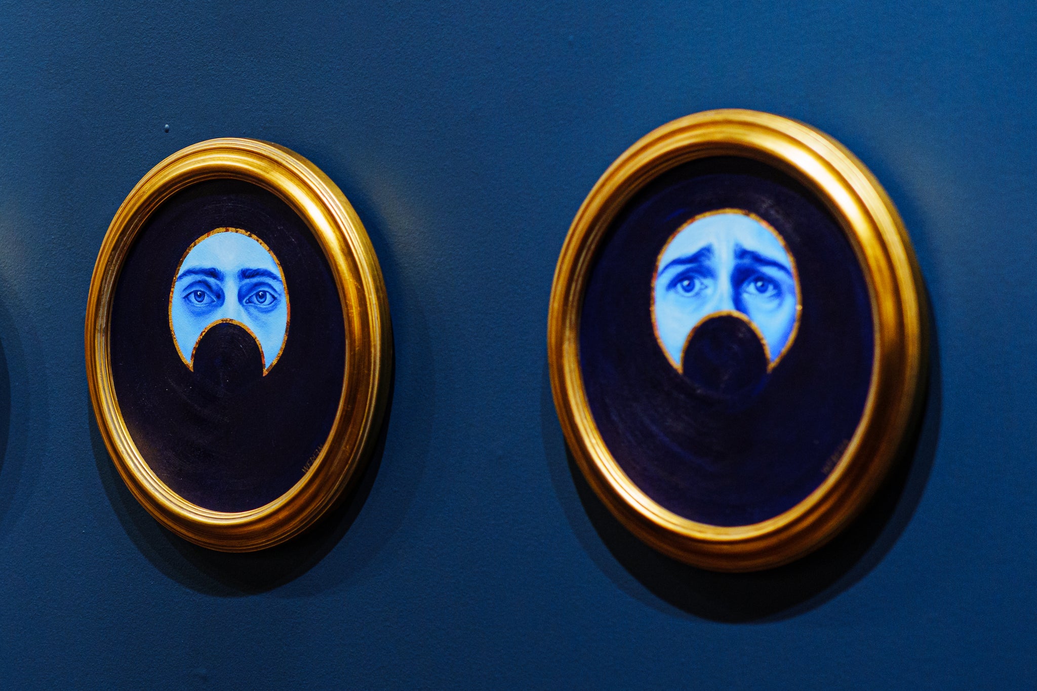 The deep blue backgrounds suggest the night sky, and the golden crescents frame each expression with clarity and focus. In this series, the moon is not distant or abstract, but intimately human, reflecting vulnerability, grief, and resilience.